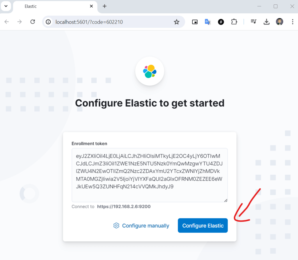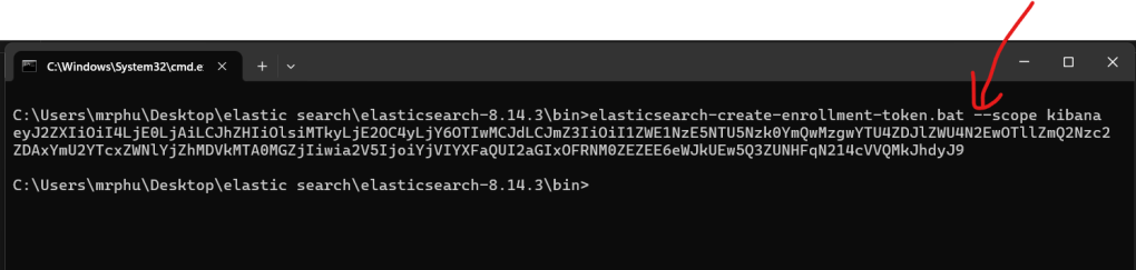 Step 5: To get the enrollment token, please execute the command elasticsearch-create-enrollment-token.bat –scope kibana on the folder /bin/ of the elasticsearch application.