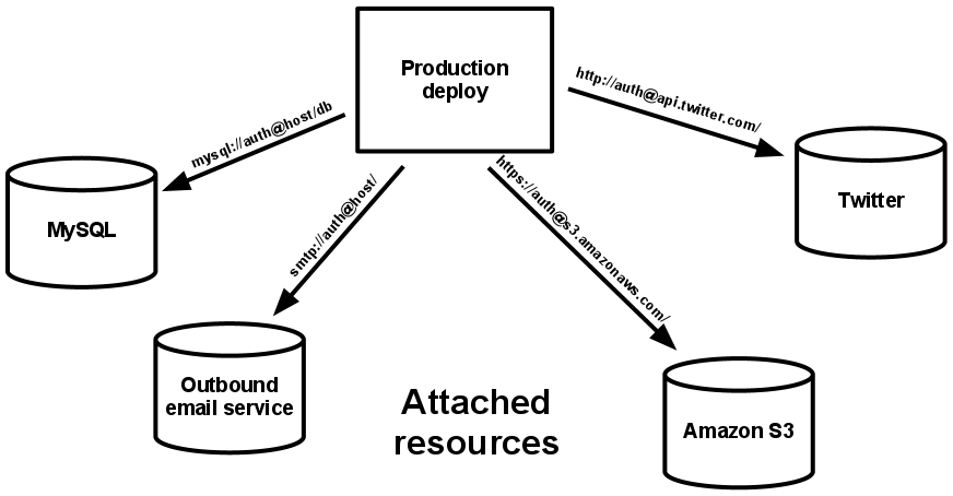 Tất cả các resource này, theo đúng tinh thần Twelve-Factor, nên được app truy cập thông qua các resource handles trong config như DATABASE_URL, REDIS_URL, SMTP_URL, STORAGE_ENDPOINT, PAYMENT_API_BASE_URL, PAYMENT_API_KEY. Khi chuyển từ local sang staging, hoặc từ self-hosted sang managed service, thứ thay đổi là config, không phải code.