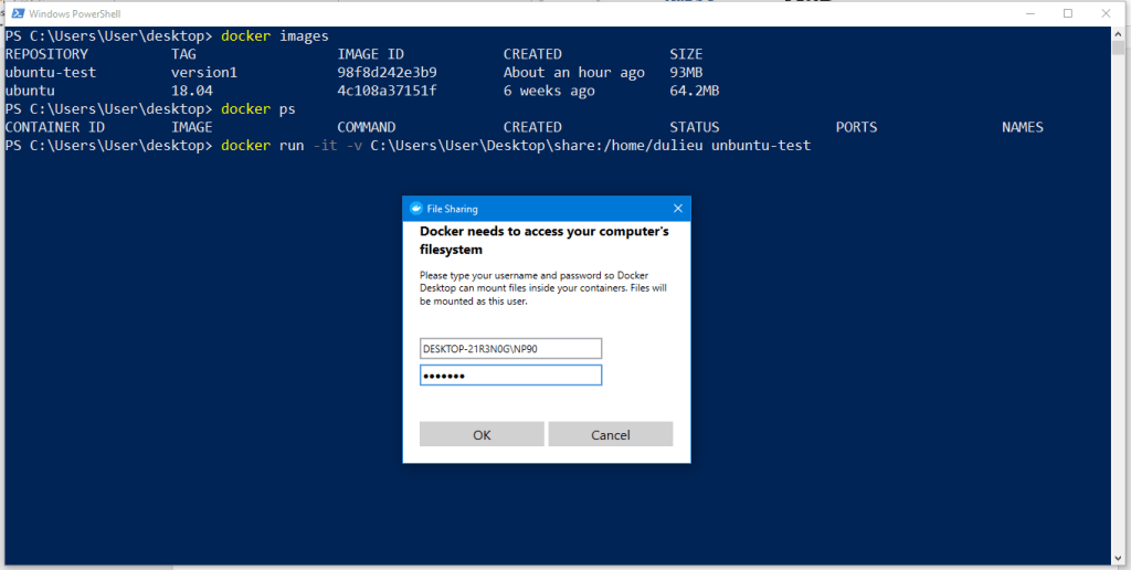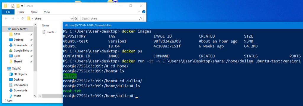 Để chia sẻ thư mục giữa container và máy host ta làm như sau: