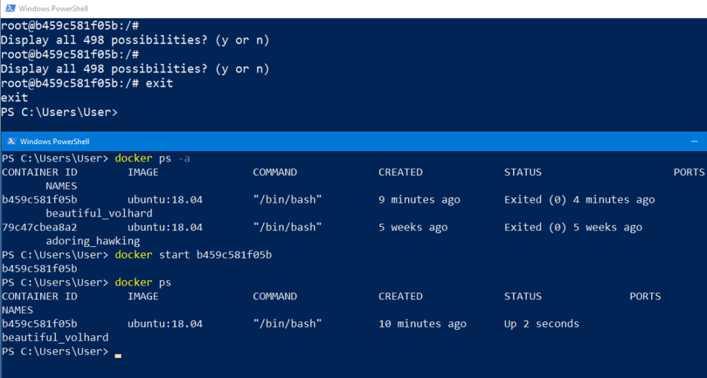 Khi ta gõ lệnh exit để thoát khỏi container đang chạy ta kiểm tra lại docker ps sẽ thấy như sau