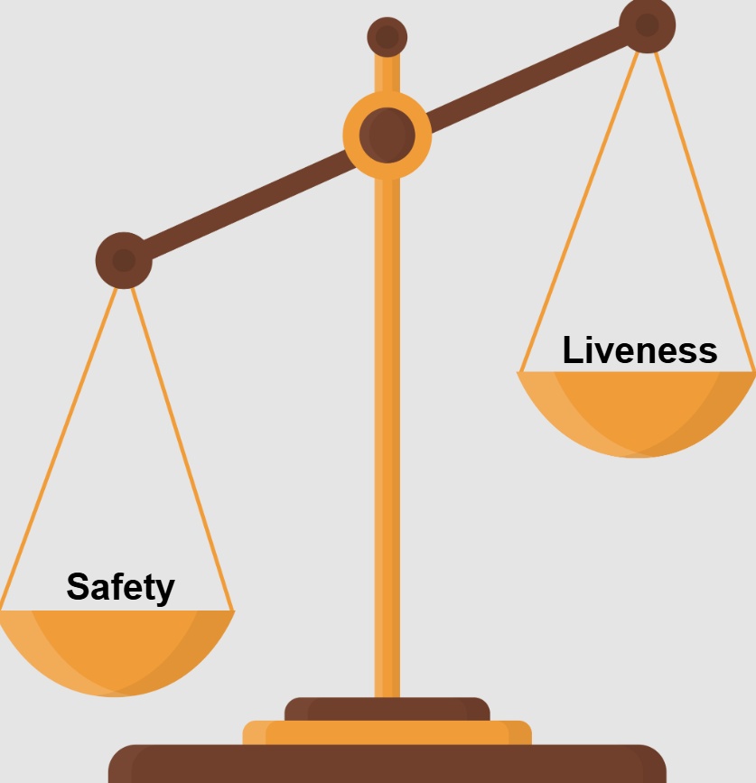 Trong suốt loạt bài này, sẽ ngày càng rõ ràng rằng tồn tại một sự căng thẳng vốn có giữa các thuộc tính an toàn và thuộc tính sống. Thực tế, như chúng ta sẽ thấy ở phần sau của loạt bài, có một số bài toán khiến việc thỏa mãn đồng thời cả hai loại thuộc tính này trở nên bất khả thi về mặt vật lý. Vì vậy, chúng ta cần chấp nhận đánh đổi một số thuộc tính sống để duy trì tính an toàn.